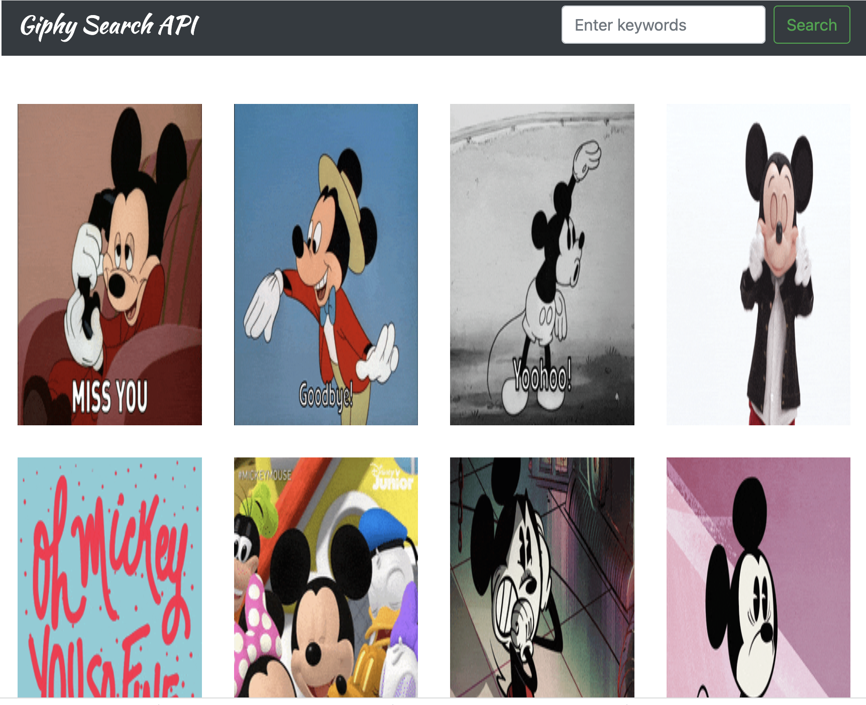 Description: Giphy Search API is an application that will allow user to enter and submit a keyword and then makes a request to the Giphy API based on that keyword, receives and parses the response and displays images on the page from that response. This page is also responsive that it looks good and works well on both desktop and mobile devices.